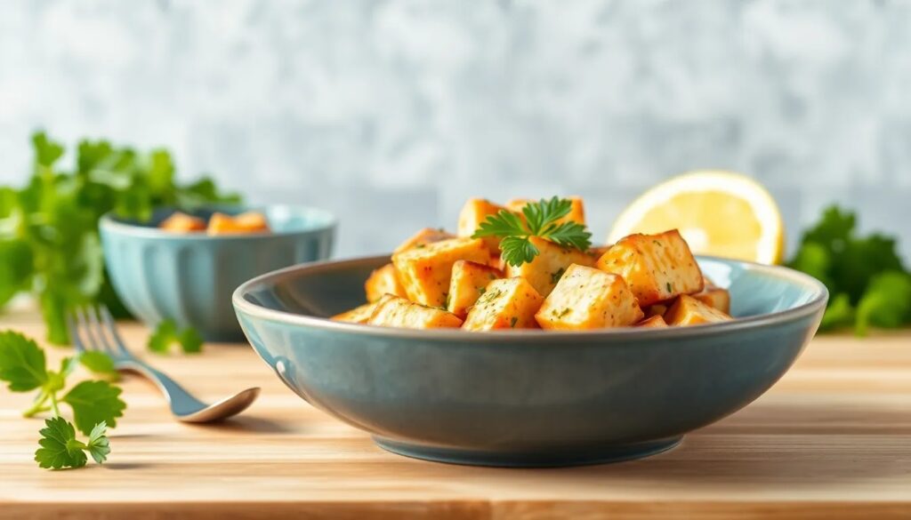 El tofu marinado es un complemento versátil que puedes disfrutar en múltiples platos. Aquí algunas ideas: